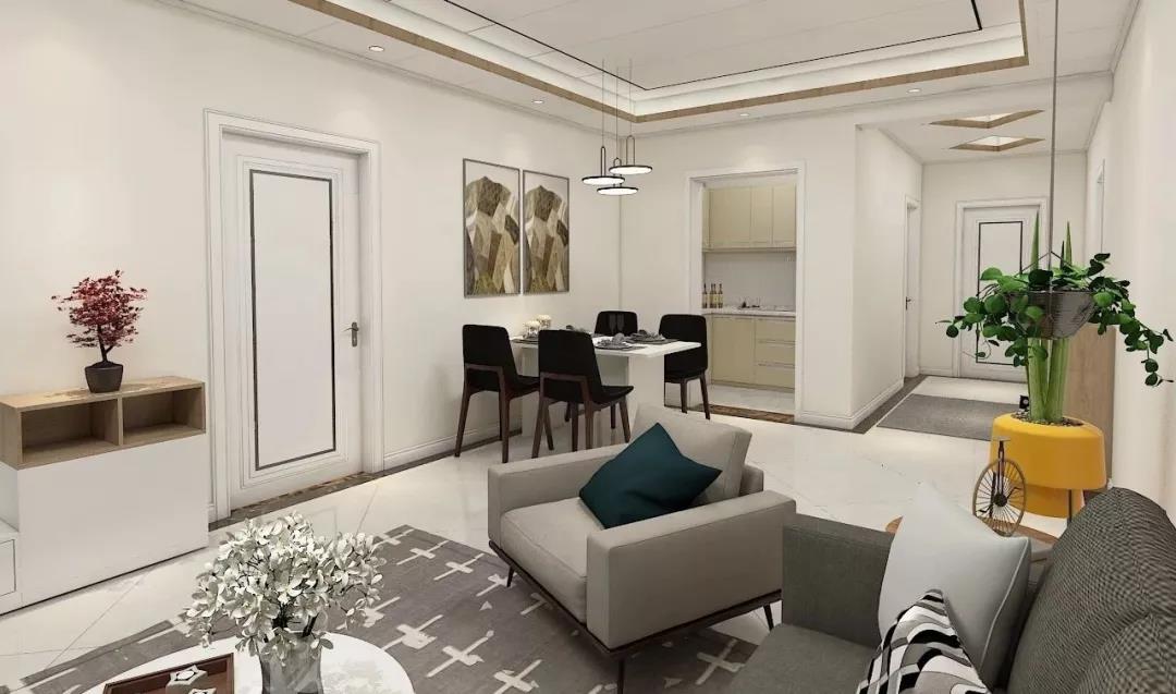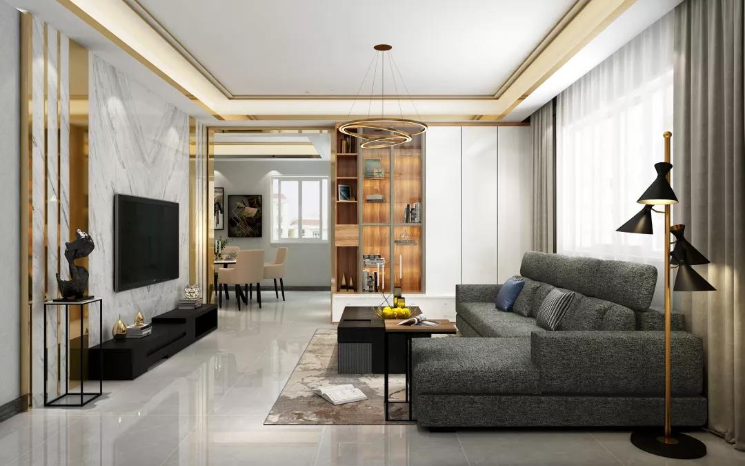 無論在客廳還是餐廳,墻面、吊頂、落地燈,都能看到質感的金色。簡潔灰色與輕奢金色元素的結合運用,都體現出精致的細節,使整個空間變得格外的光彩奪目。