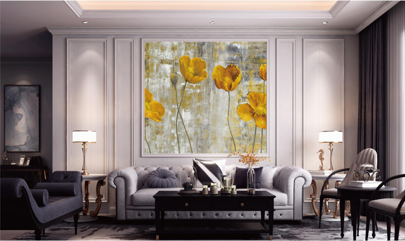 淡淡的米黃與明黃交相輝映,為空間構建出典雅的法式腔調,深色的花朵更是將法式風格的沖突美表現得淋漓盡致。