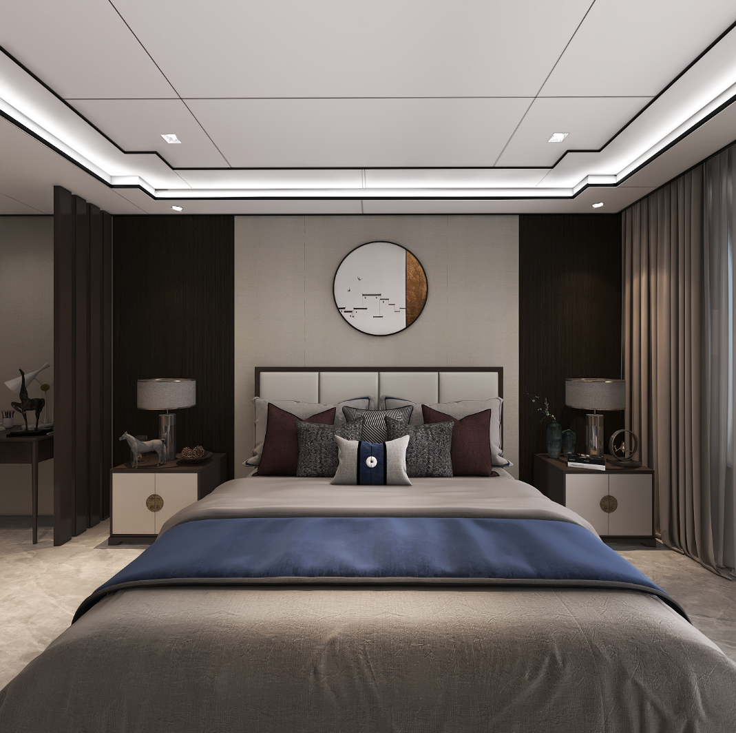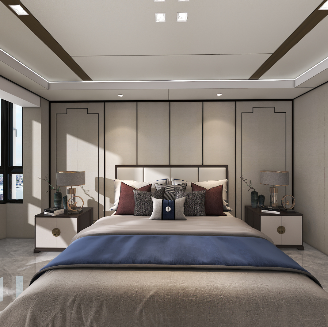 臥室背景墻兩側木飾面墻板對稱分布,床頭適當留白,利落的裝飾線條,中間搭配一副好看的山水裝飾畫,豐富空間層次,在濃濃古韻中滲透幾許現代氣息,與新中式風格交融而不違和。