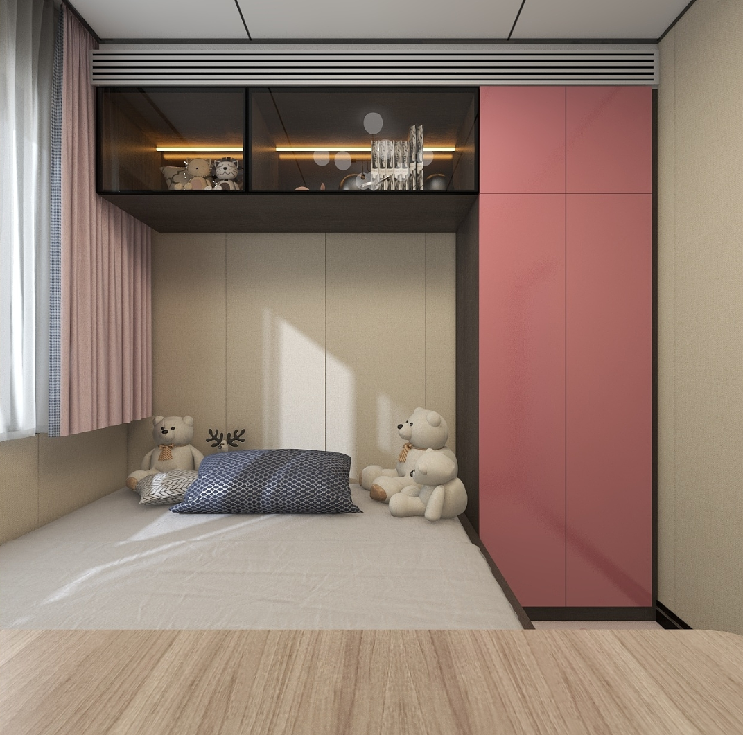 兒童房不大,靠窗定制榻榻米,提高了空間利用率,滿足小孩子收納等需求,功能強大!墻面沿用主次臥同色布紋墻板,使整體風格統一。