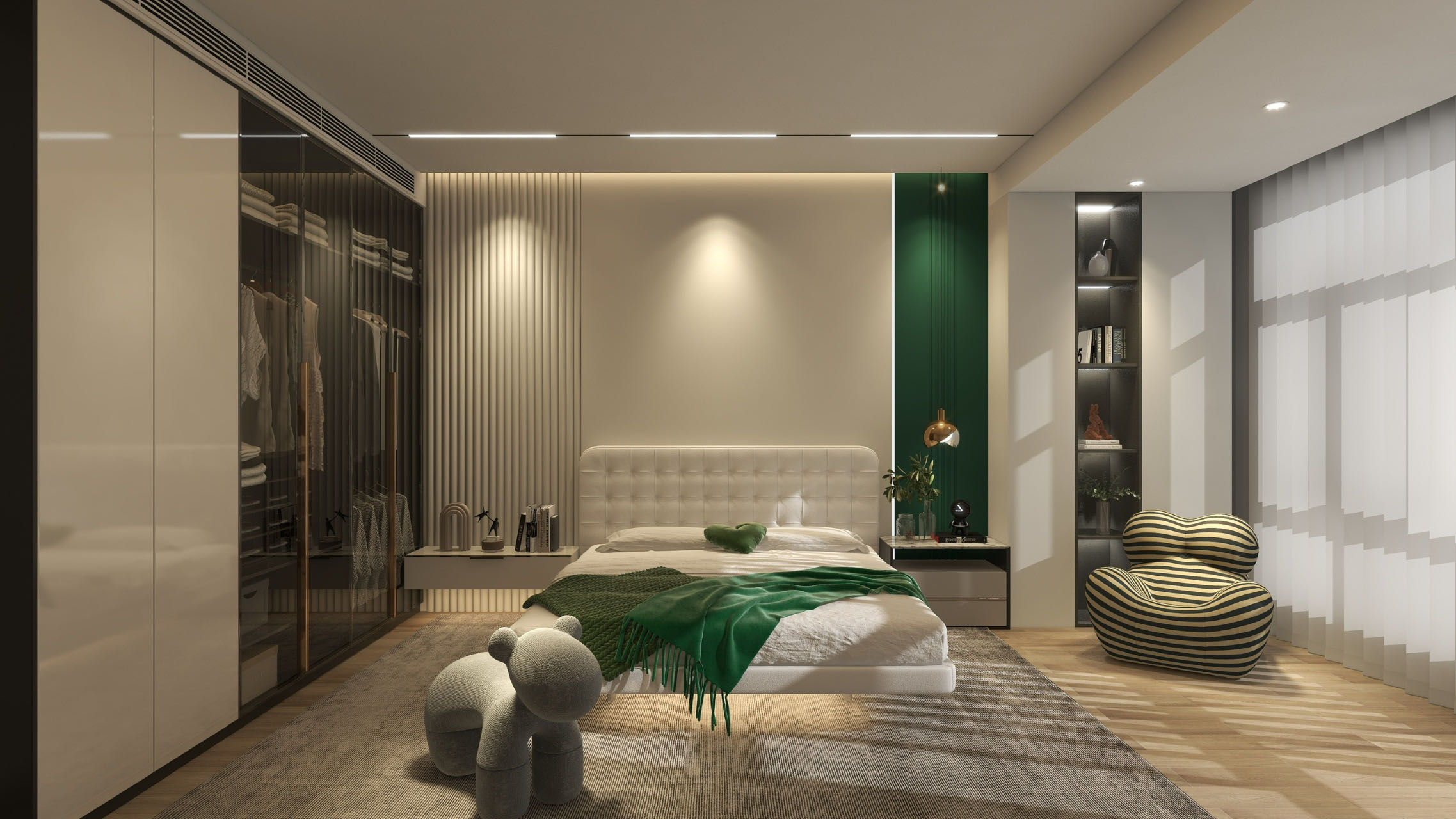 在絲絨布紋白的主色中點綴以墨綠為主的綠色調,白中綴綠的設計風格給人一種深沉而舒適的感覺,搭配簡約的燈光效果更是別有一番韻味!