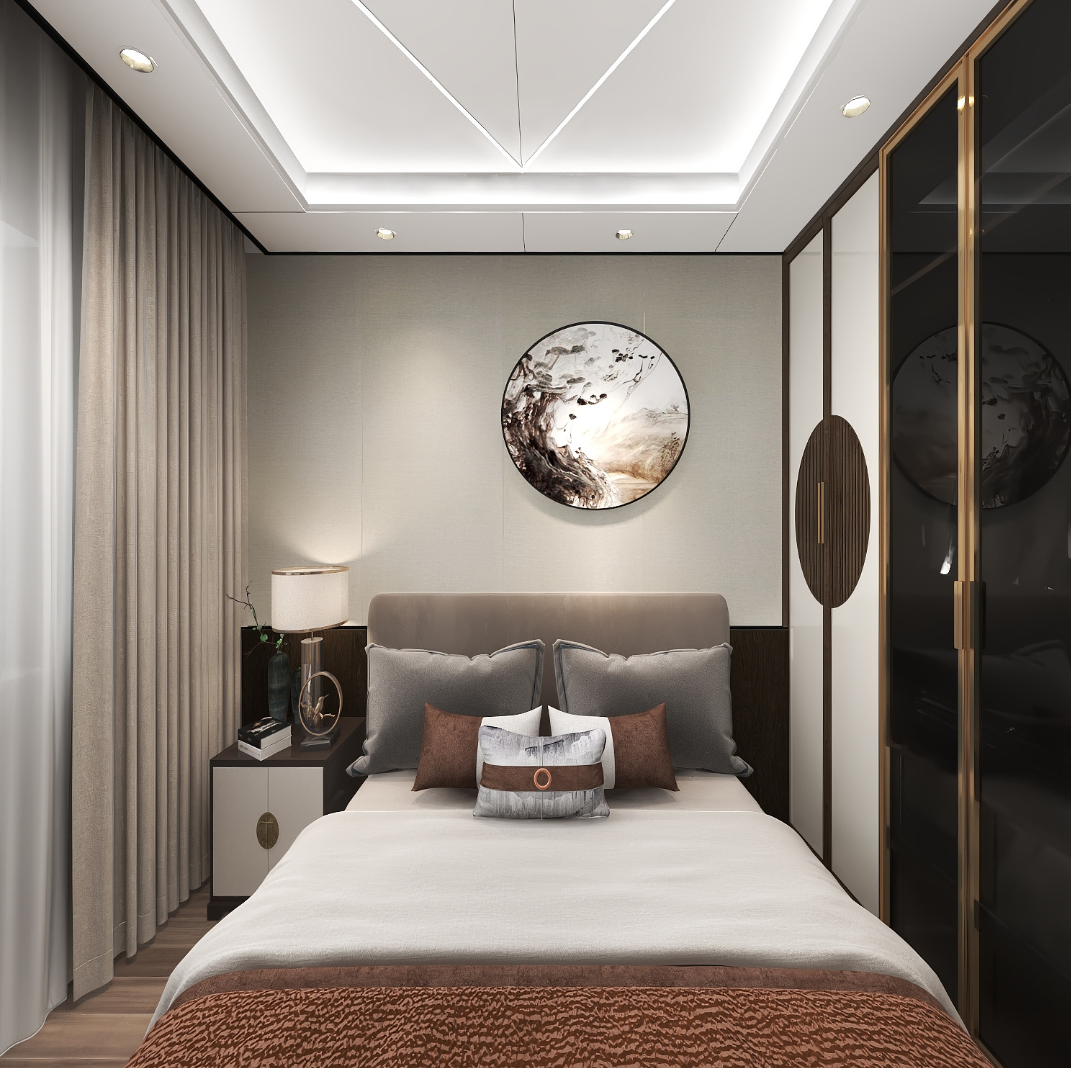 新中式調和溫潤典雅的視覺氛圍,全屋采用暖色系光感,深色木紋沉穩細膩且溫潤醇厚沁潤著秋日的優雅與深邃