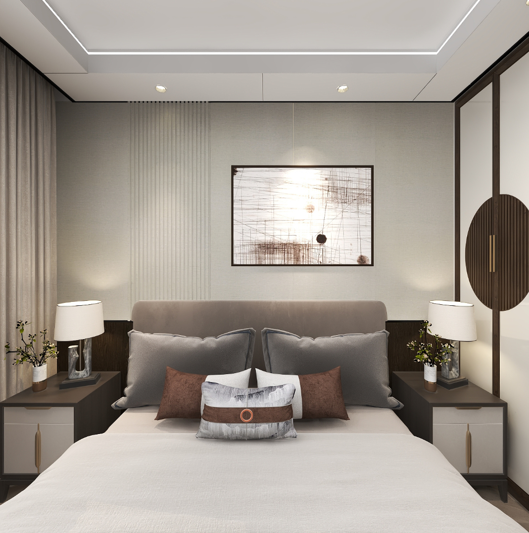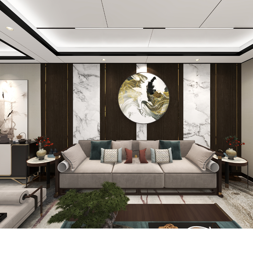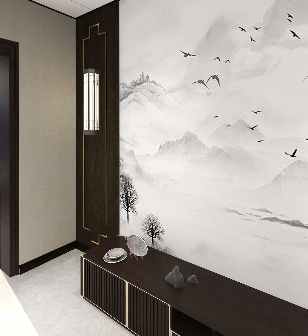 淺色的美拉德風格,以巨幅5D中式水墨畫為主色調,搭配灰色調冷布藝,一明一暗,仿佛高山流水,渾然天成。
