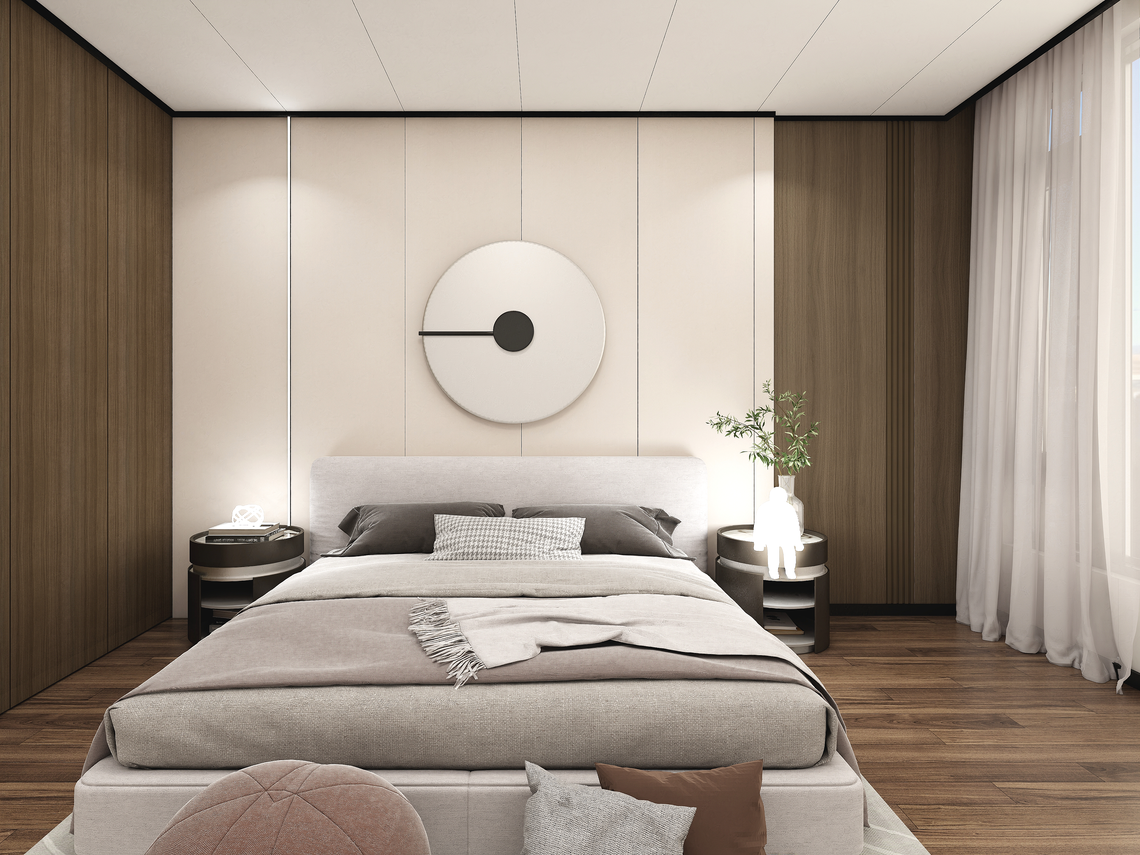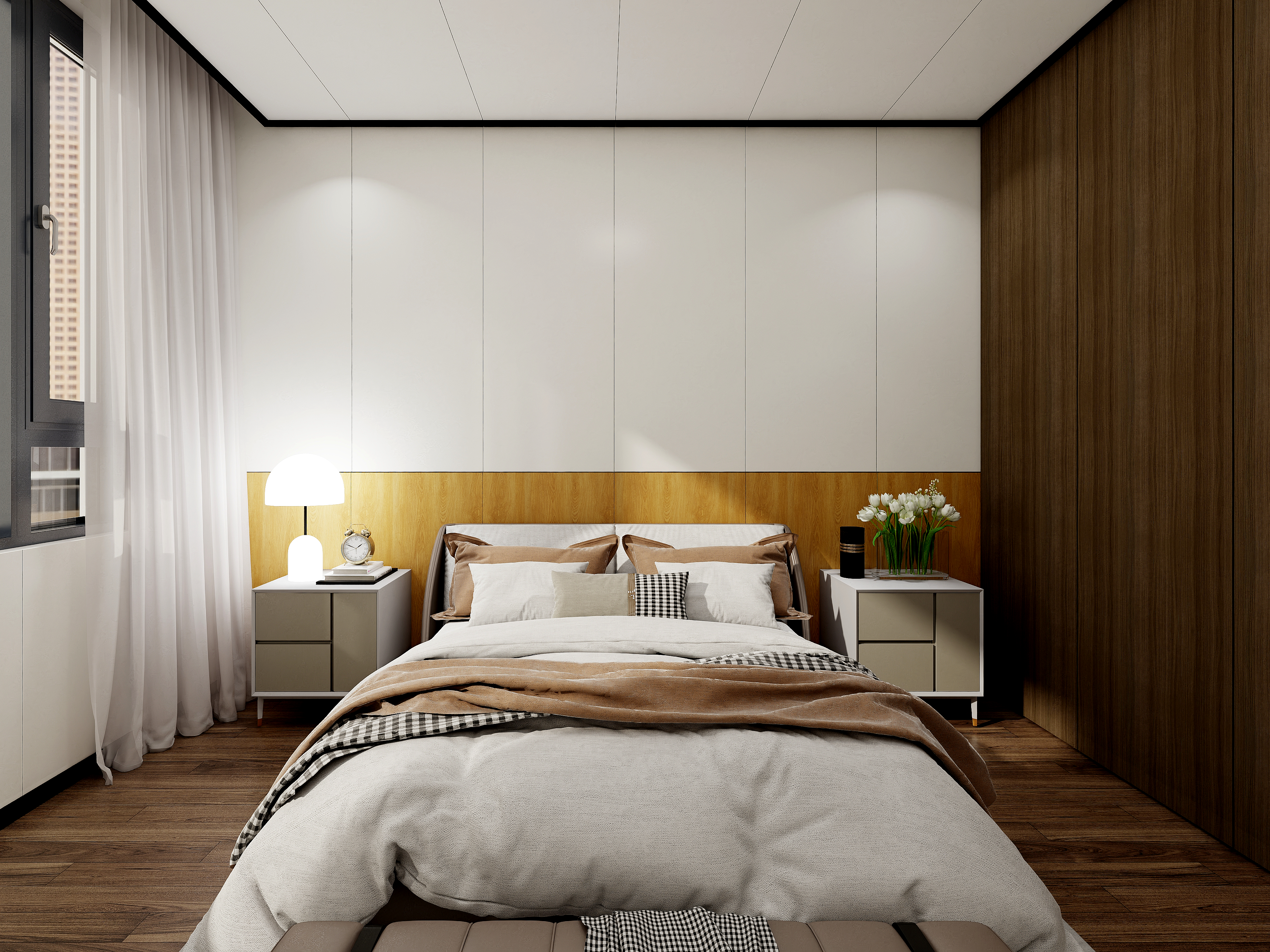 主臥床頭背景墻采用星優木實心板集成墻板,直接一板到頂,美觀大氣。