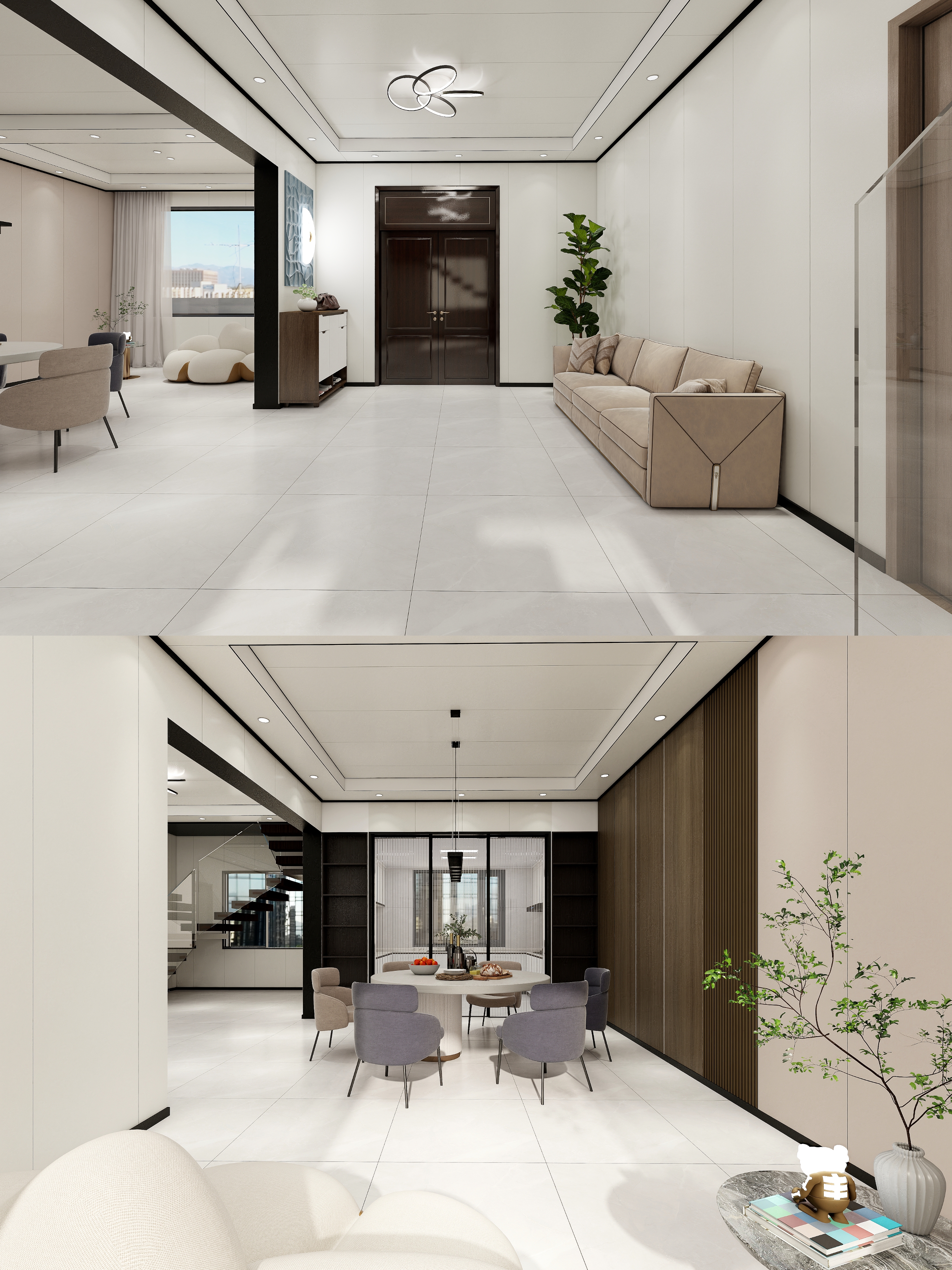 一層客餐廳墻面大面積使用串珠布紋+米咖色這兩種淺色布紋通鋪,餐桌背景墻使用加拿大胡桃木紋墻板搭配同色格柵,主色系為淺色,搭配上深色點綴,空間層次感會更強,反倒能突出在家里的每件物品哦!