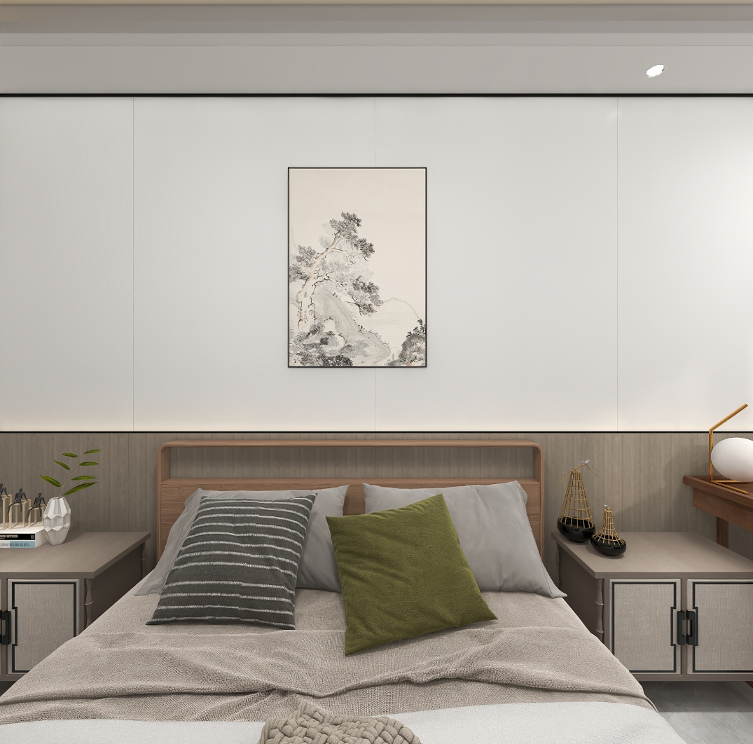 這款臥室背景墻,以簡潔的線條與素雅的色調為基礎,在質樸的木質之間,在自然的水墨之間,都能洞見新中式的“腳印”。材質之間的融合,這些墨韻元素不張揚,但在細節中透露出深厚的文化底蘊。