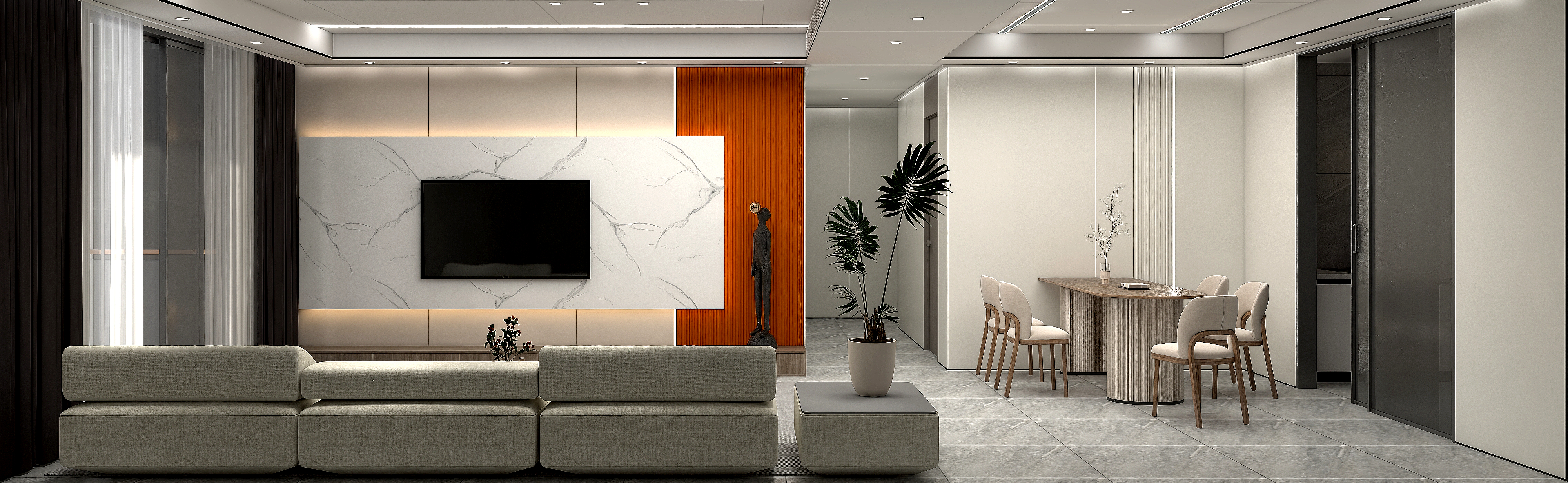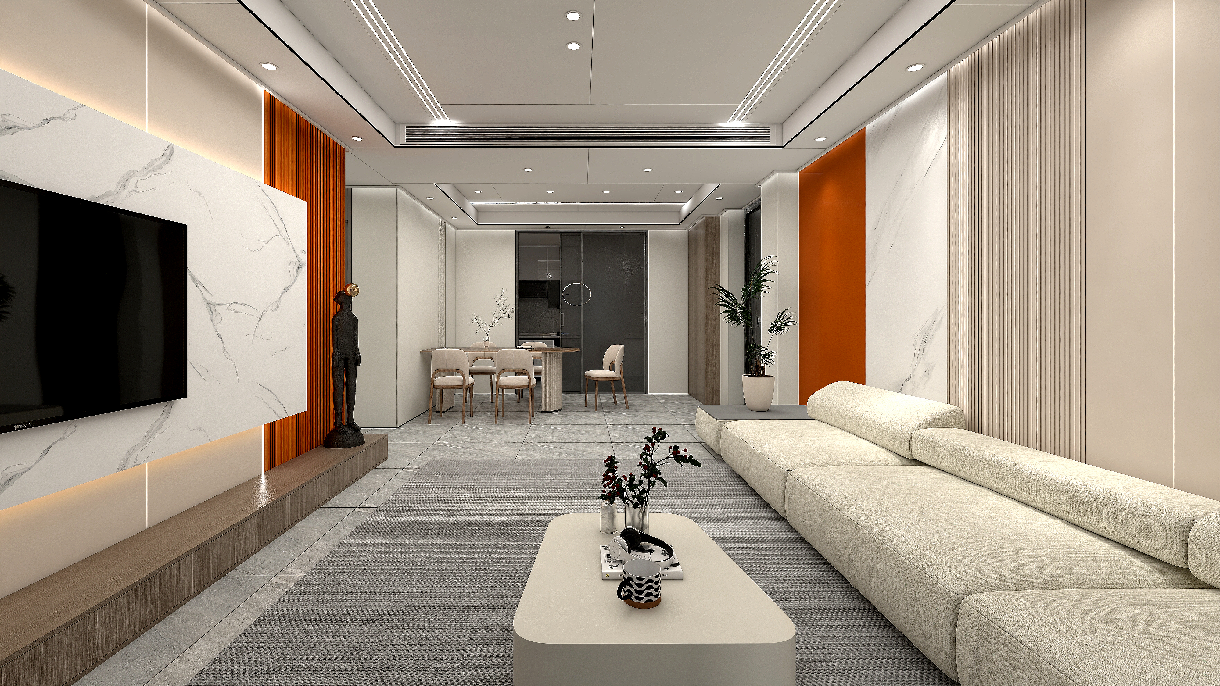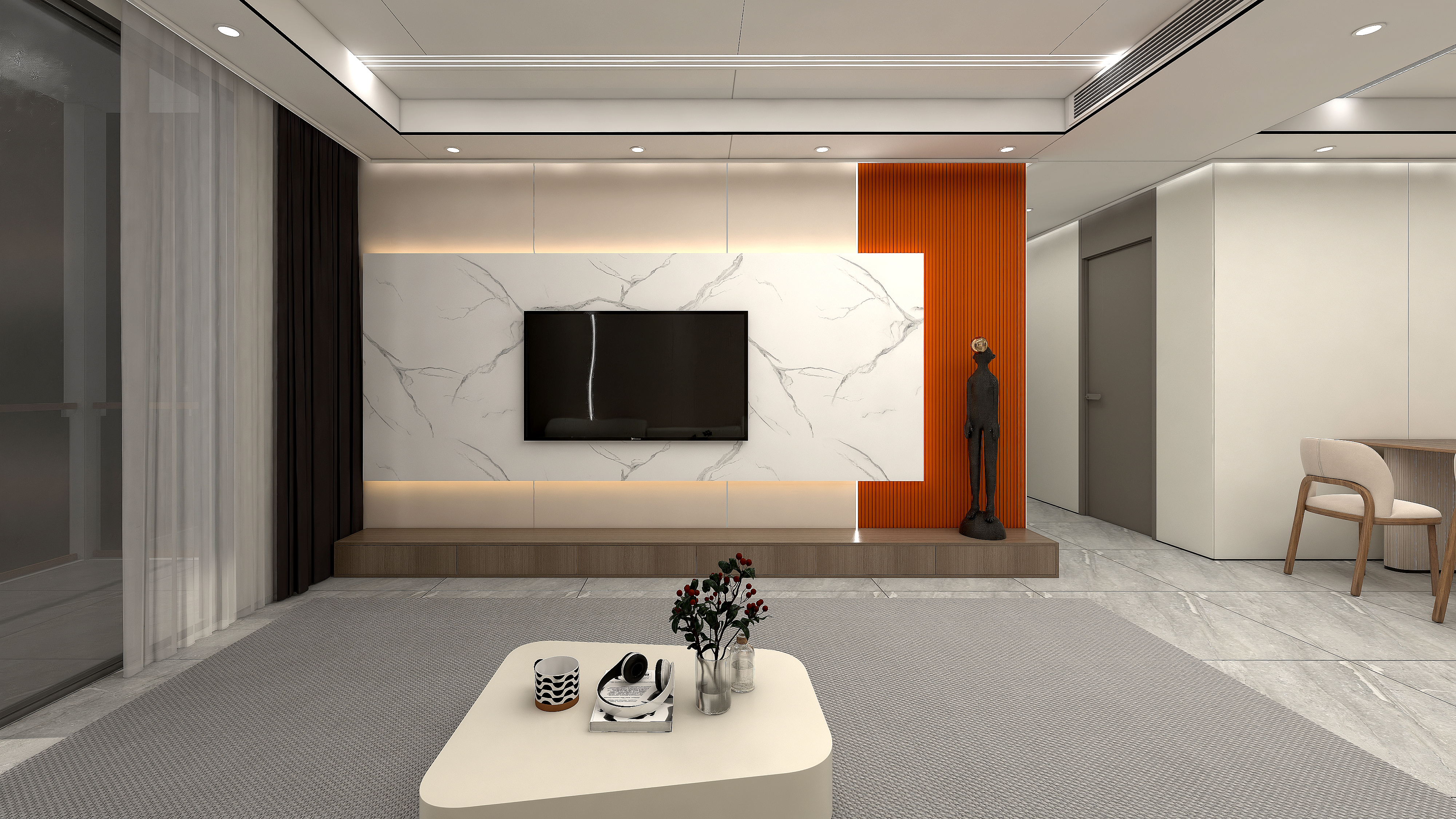 空間和材質(zhì)的完美融合,膚感米咖搭配3D石紋打印畫打造的懸浮電視背景墻,愛馬仕橙的配色點(diǎn)亮沉悶的空間。