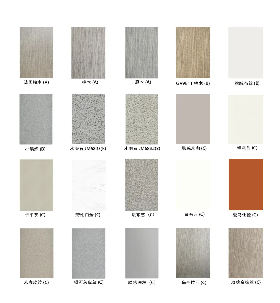 產品提供多種顏色選擇,包括純色、金屬、石紋、鏡面和布紋等等,滿足不同客戶的需求。讓您的空間更加豐富多彩。