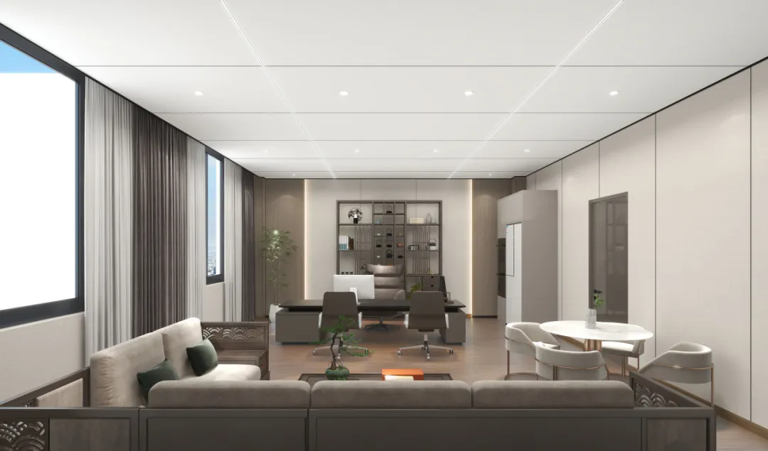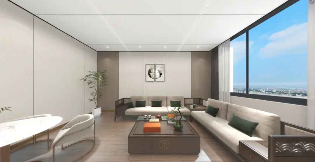 通過(guò)木紋防撞板的應(yīng)用,辦公區(qū)、會(huì)議區(qū)及會(huì)客區(qū)既保持了統(tǒng)一的風(fēng)格,又實(shí)現(xiàn)了功能分區(qū)。特別在會(huì)客區(qū)辦公室,融入新中式元素,讓整個(gè)空間在實(shí)用之余更顯雅致。