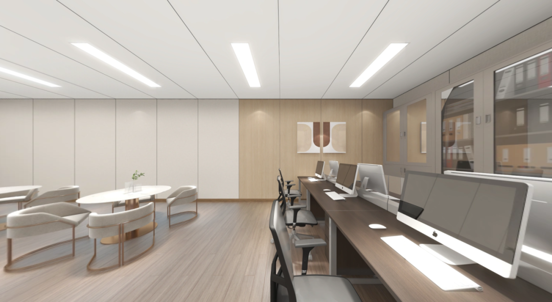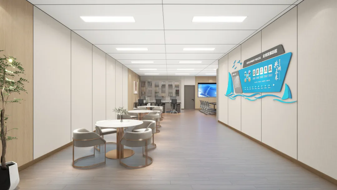 辦公區(qū)墻面采用原木和布紋防撞板通鋪,視覺(jué)上拉高空間感,同時(shí)保持防撞板抗沖擊性能,有效抵御日常磕碰,延長(zhǎng)使用壽命。