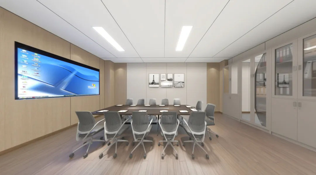 會(huì)議區(qū)的設(shè)計(jì)既要滿足日常辦公需求,又要兼顧現(xiàn)代商務(wù)氛圍。本次改造巧妙運(yùn)用星優(yōu)木防撞板與原木元素,結(jié)合超大顯示屏,營(yíng)造溫暖自然的會(huì)議氛圍。