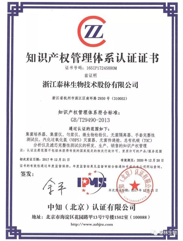 知識(shí)產(chǎn)權(quán)作為科技創(chuàng)新發(fā)展的重要因素,在努力創(chuàng)新的同時(shí)加強(qiáng)保護(hù)與風(fēng)險(xiǎn)防范,知識(shí)產(chǎn)權(quán)管理體系的建設(shè)具有十分重大的意義。泰林生物董事長葉大林先生表示,獲得國家級(jí)認(rèn)證機(jī)構(gòu)的知識(shí)產(chǎn)權(quán)管理體系認(rèn)證,是對(duì)泰林生物知識(shí)產(chǎn)權(quán)管理工作的認(rèn)可和激勵(lì),標(biāo)志著泰林生物知識(shí)產(chǎn)權(quán)管理工作邁上一個(gè)新的臺(tái)階。未來,泰林生物將完善知識(shí)產(chǎn)權(quán)管理體系,進(jìn)一步做好知識(shí)產(chǎn)權(quán)工作,為公司經(jīng)營發(fā)展貢獻(xiàn)更大力量。