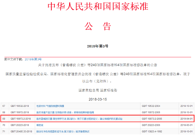 3月15日,國家質量監(jiān)督檢驗檢疫總局、國家標準化管理委員會發(fā)布2018年第3號中國國家標準公告,對新一批國家標準予以公布,其中包括了由泰林生物為第一起草單位的國家標準《醫(yī)療器械的滅菌 微生物學方法 第2部分:用于滅菌過程的定義、確認和維護的無菌試驗》。
