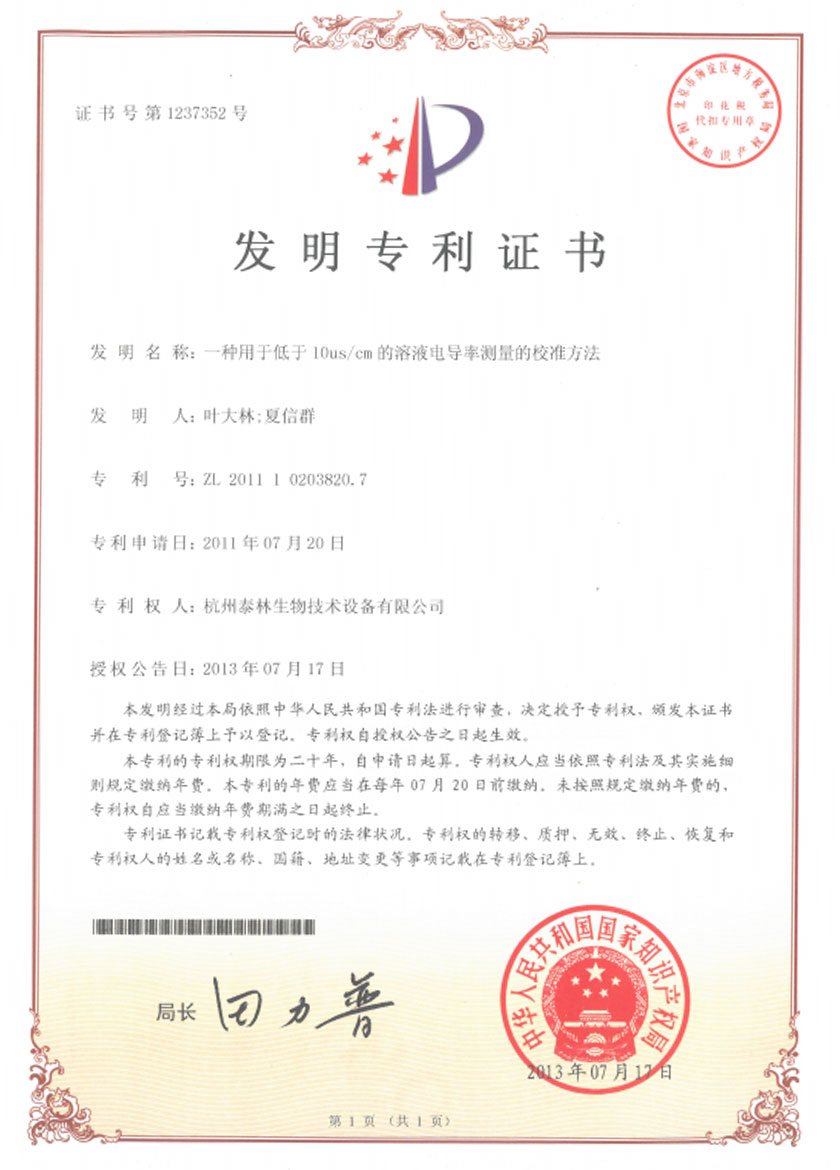 一種用于低于10us/cm的涫寢電導(dǎo)率測量的校準(zhǔn)方法ZL 2011 1 0203820.7 -