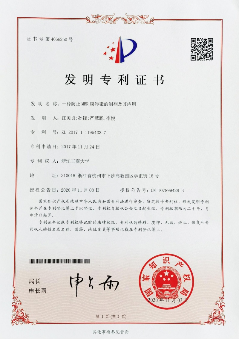 一種防止MBR膜污染的制劑及其應(yīng)用ZL 2017 1 195433.7 -